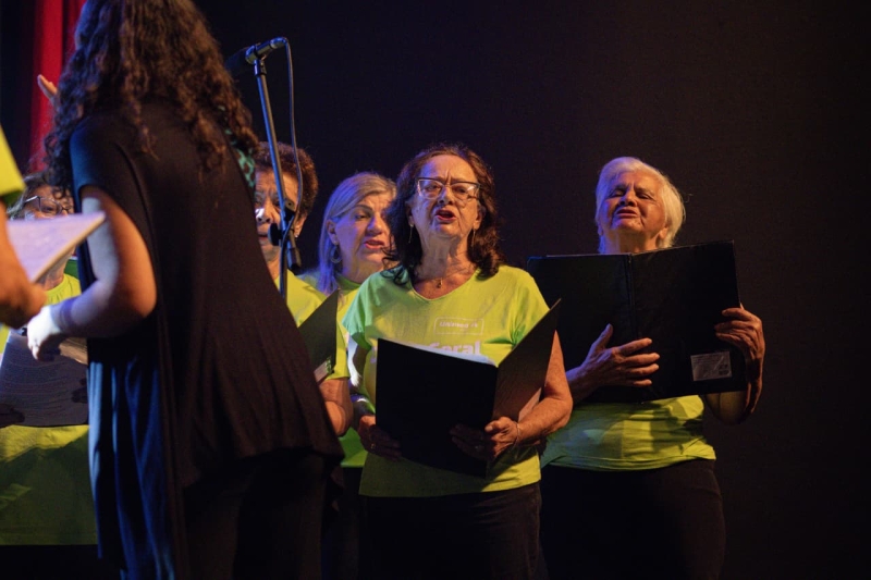Com mais de 40 integrantes, em sua maioria idosos, o Canto Coral AMU é regido pela professora musicista Larissa Magrinelli Moreira. Durante a apresentação, o grupo compartilhou seu trabalho vocal com o público, reforçando a importância da música como ferramenta de convivência, expressão e bem-estar.