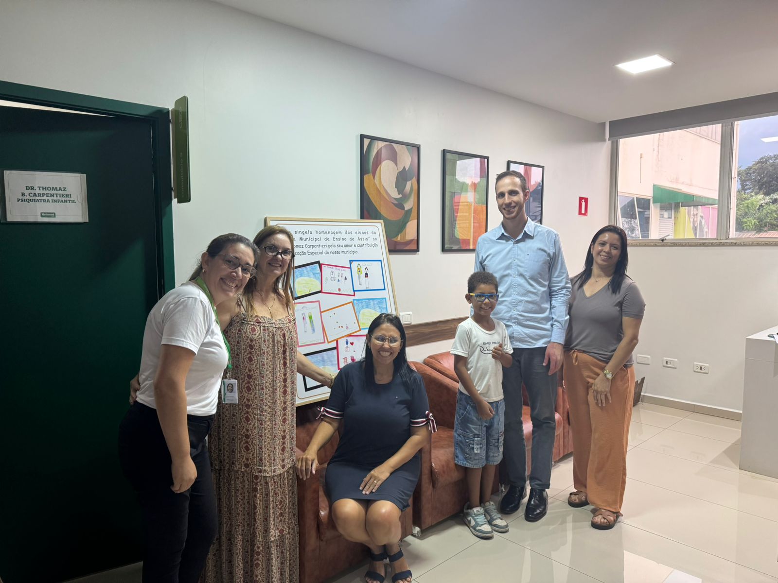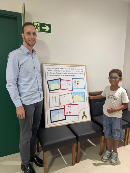 A Secretaria Municipal da Educação realizou, no dia 24 de março, uma homenagem ao médico psiquiatra Dr. Tomaz Carpentiere, na sede da Unimed Assis. Na ocasião, foi entregue um quadro com desenhos produzidos por alunos atendidos ao longo de 2025, como forma de reconhecimento e gratidão pelo trabalho desenvolvido.